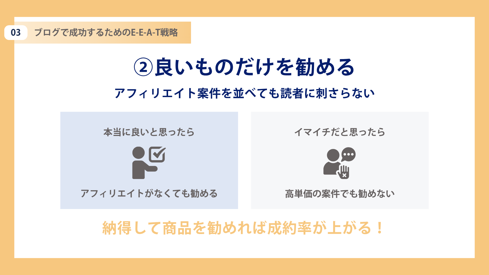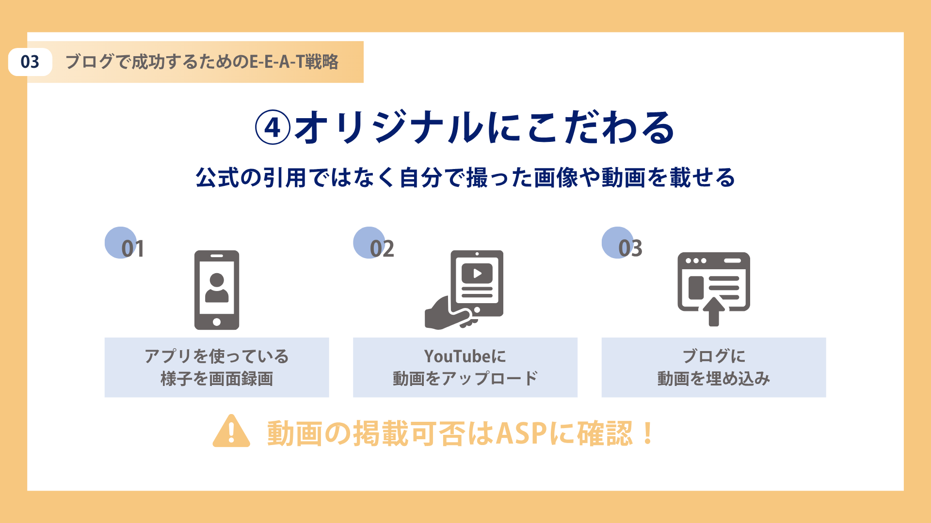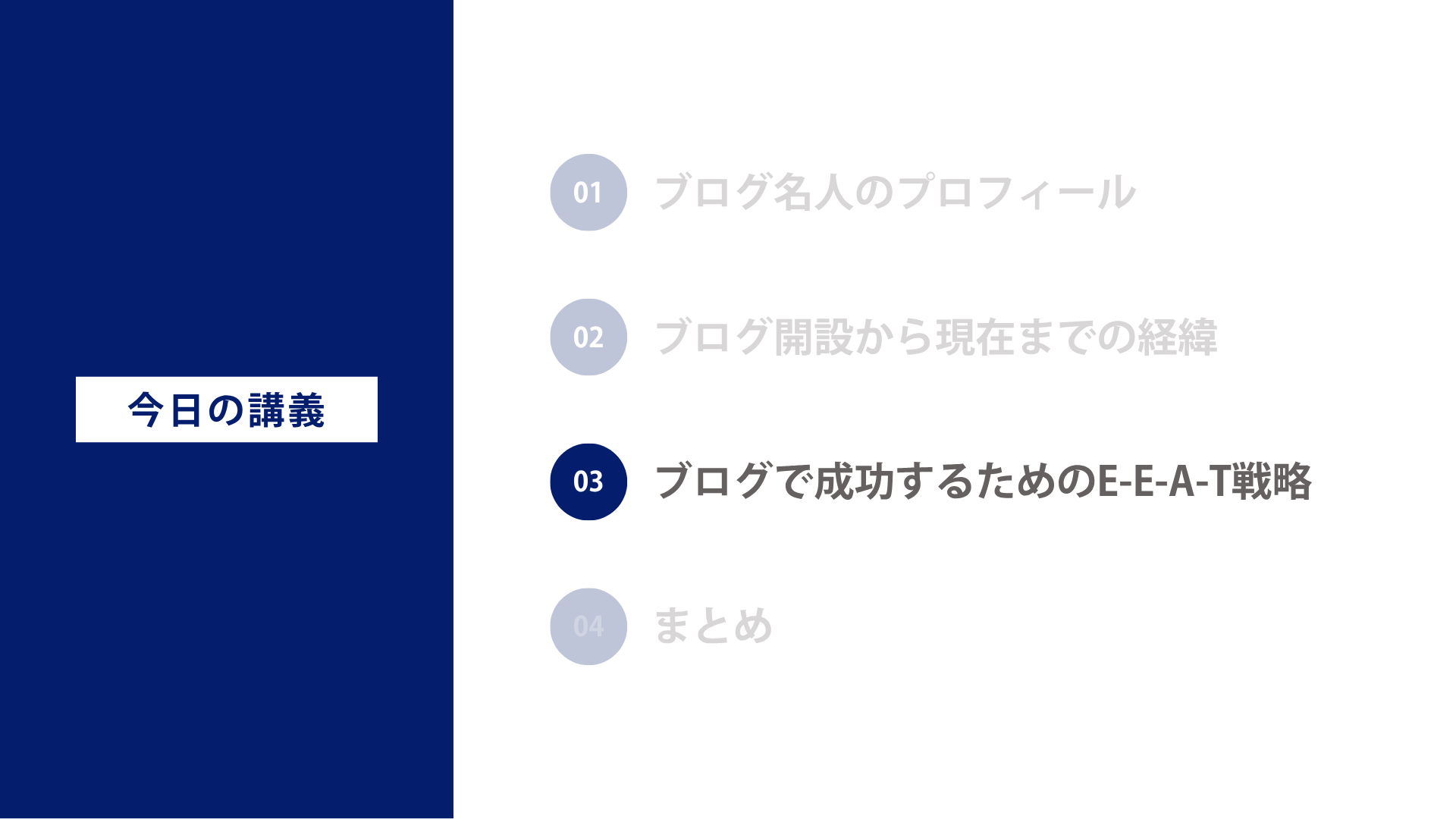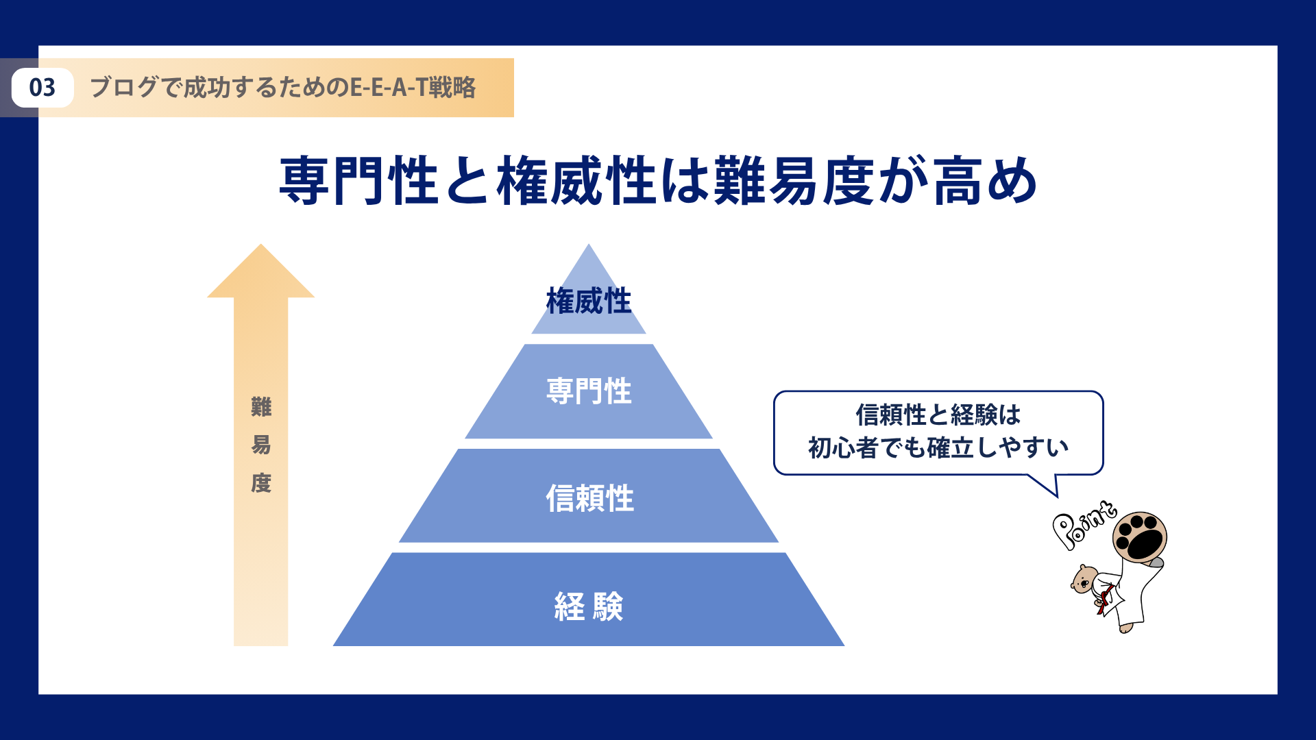 SEO対策の基礎となる「E-E-A-T」の概念をシンプルに解説し、初心者でも再現しやすい戦略をイラスト入りでスライド化しています。